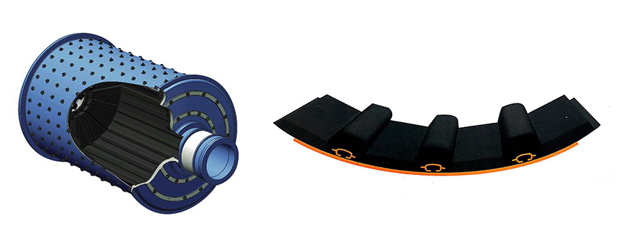 棒磨機(jī)是由筒體內(nèi)所裝載研磨介質(zhì)為鋼棒而得名,因兩端鋼棒經(jīng)過研磨后銳利,故此類設(shè)備所采用樟膠襯板主要包括:筒體橡膠襯板部分及配套緊固件,具有低噪音、抗沖擊、耐腐蝕、易更換等優(yōu)點。